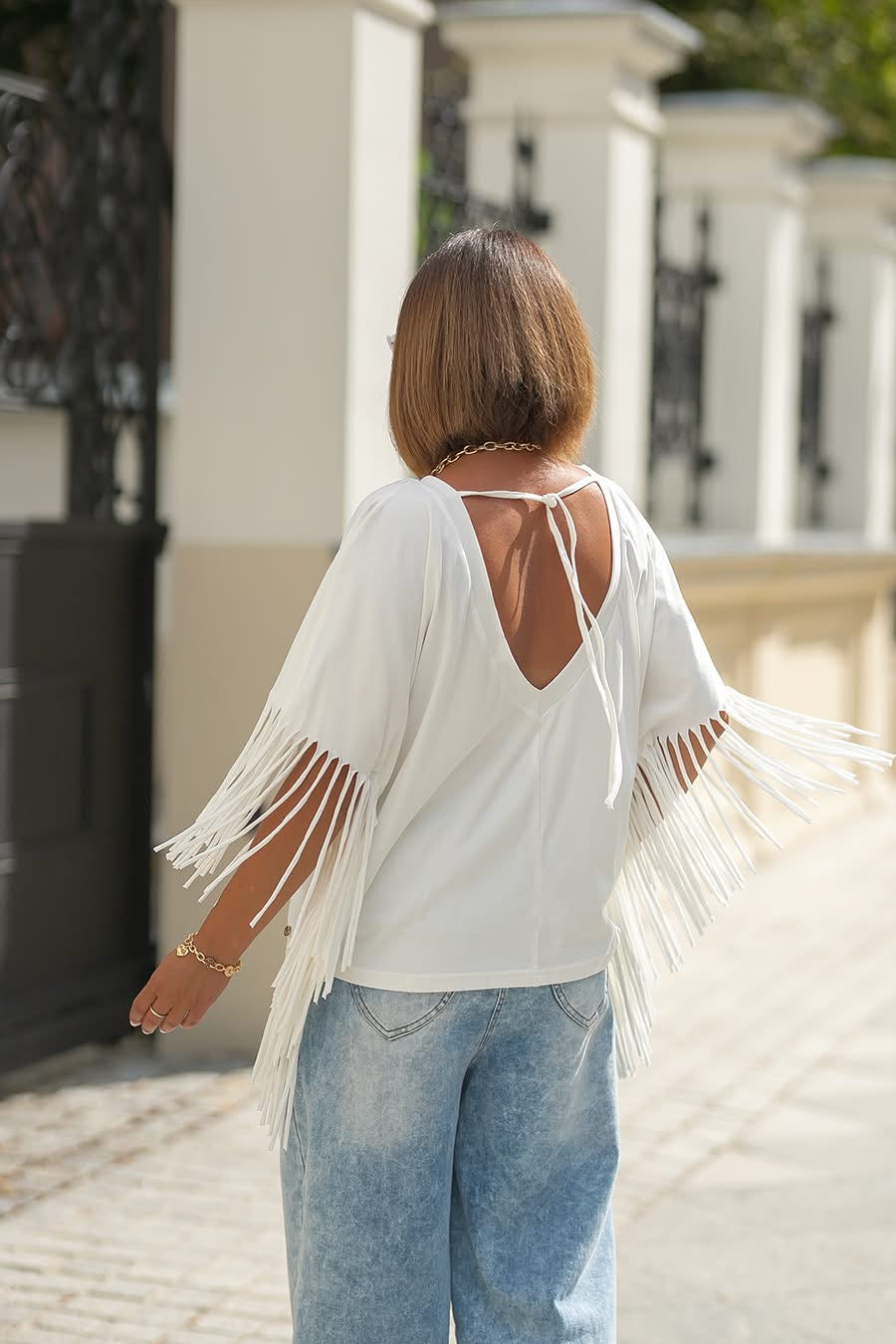 Zmysłowe rozcięcie na plecach z subtelnym sznureczkiem dodaje bluzce lekkości i elegancji. Frędzle nadają jej modowego charakteru, tworząc stylizację, obok której trudno przejść obojętnie. Idealna zarówno na co dzień, jak i na wyjątkowe okazje.