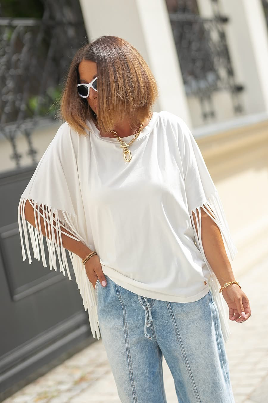 Luźna bluzka z frędzlami marki Bastet to wyjątkowy model, który łączy w sobie styl, swobodę i kobiecy urok. Delikatnie opływa sylwetkę, zapewniając pełen komfort noszenia.