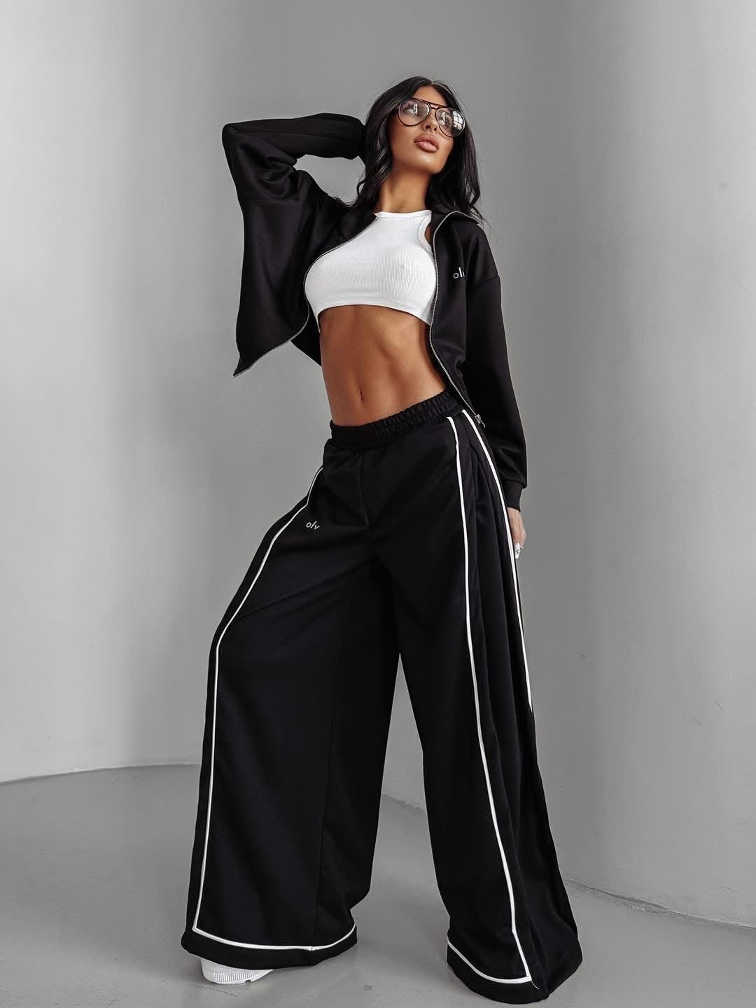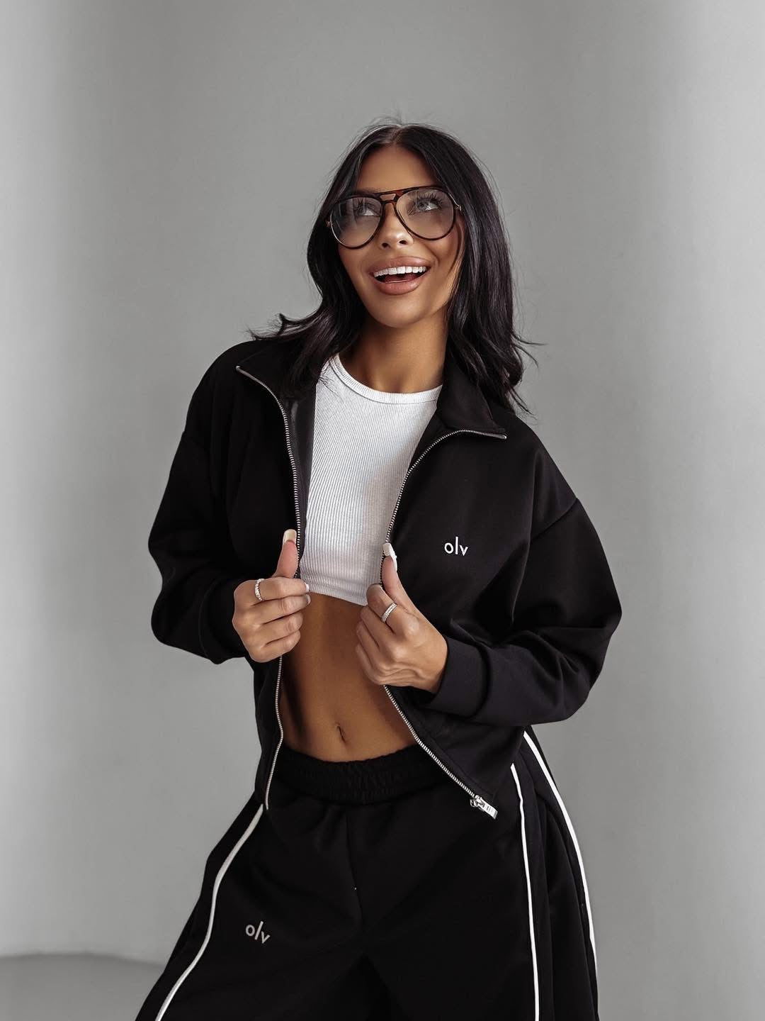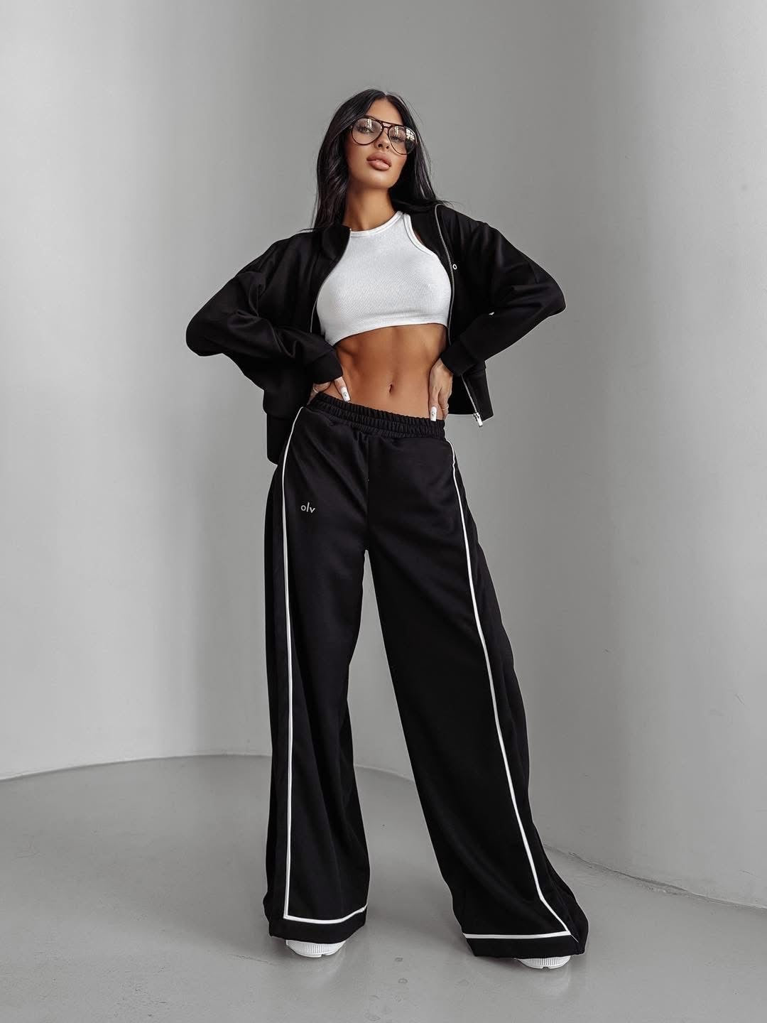 Casualowe spodnie z wysokim stanem. Wykonane z wysokiej jakości elastycznej bawełny. Produkt zdobią kontrastowe lampasy. Guma w pasie. Po bokach kieszenie oraz przykuwające oko wycięcie. Na przodzie napis OLV.