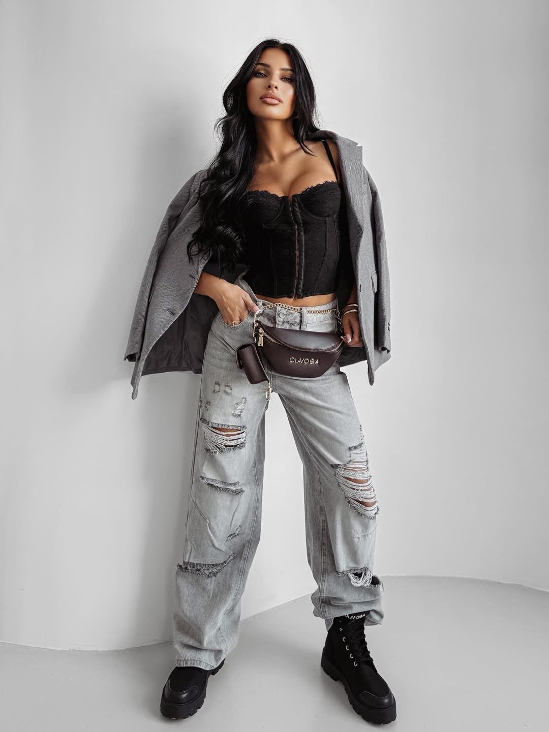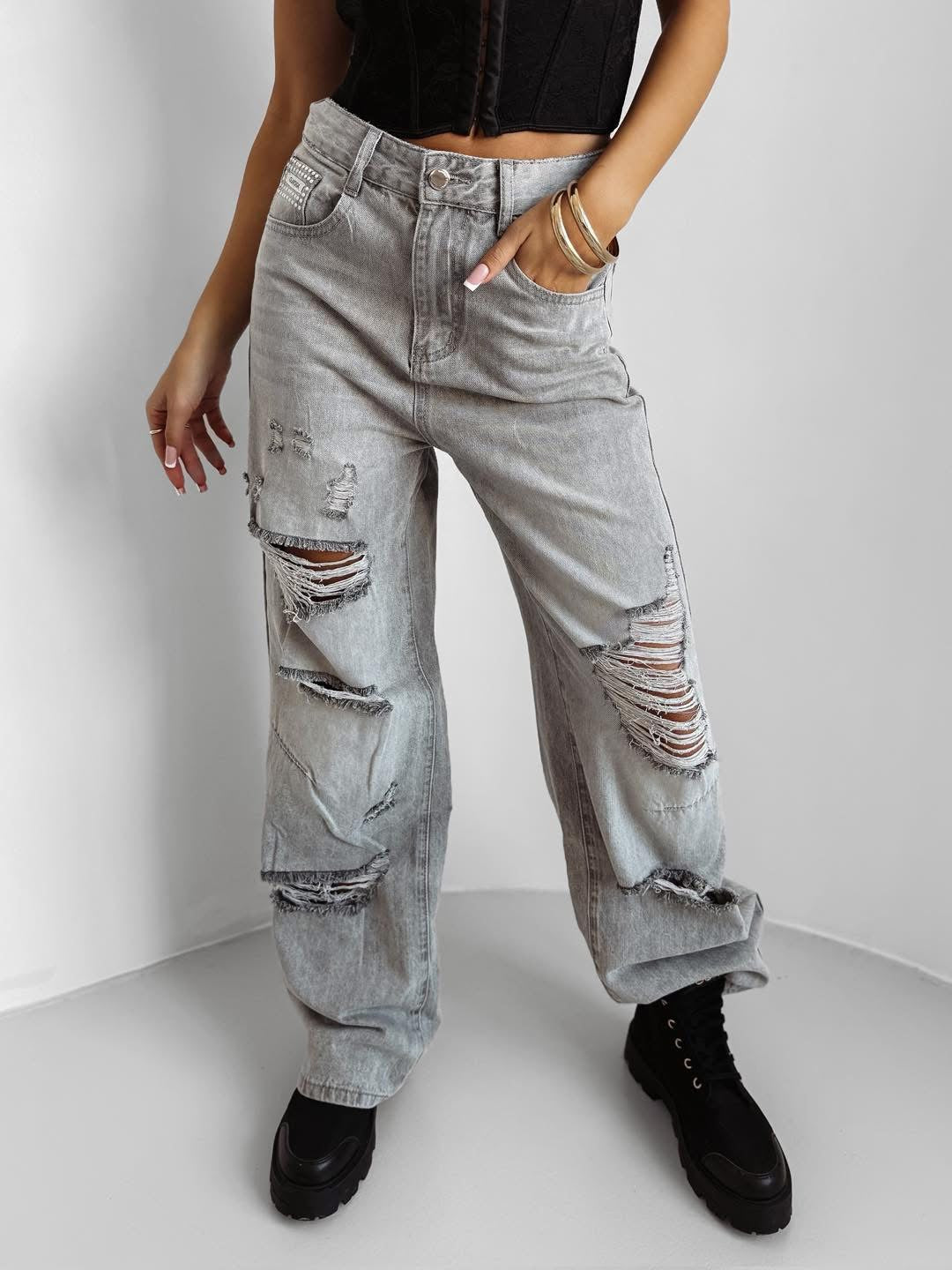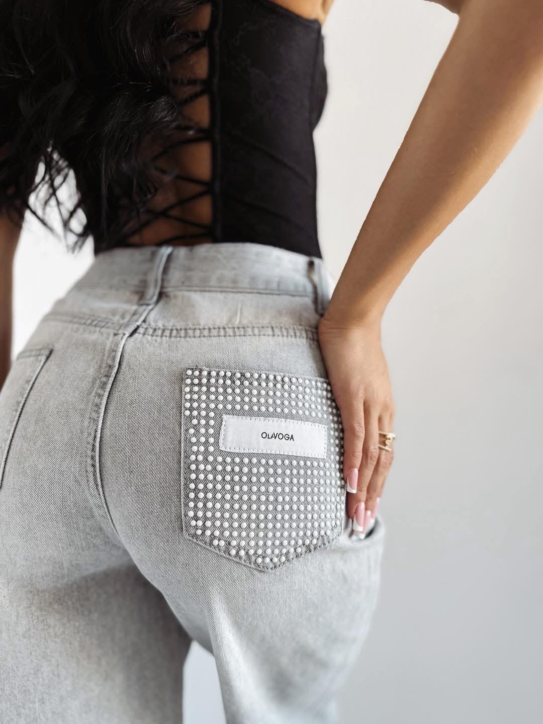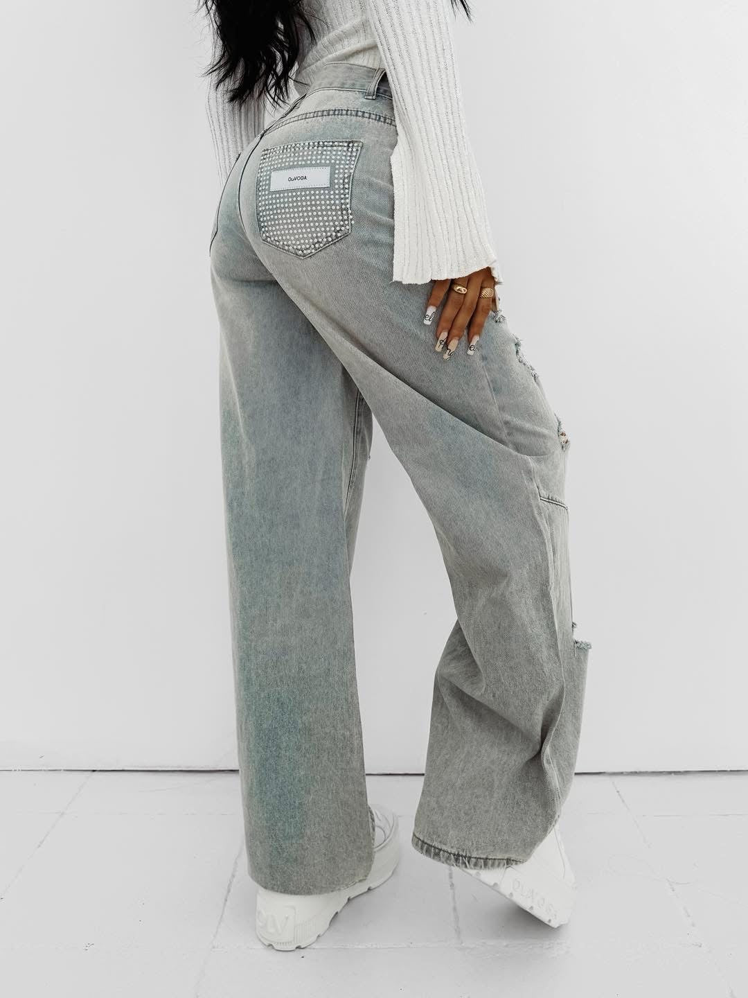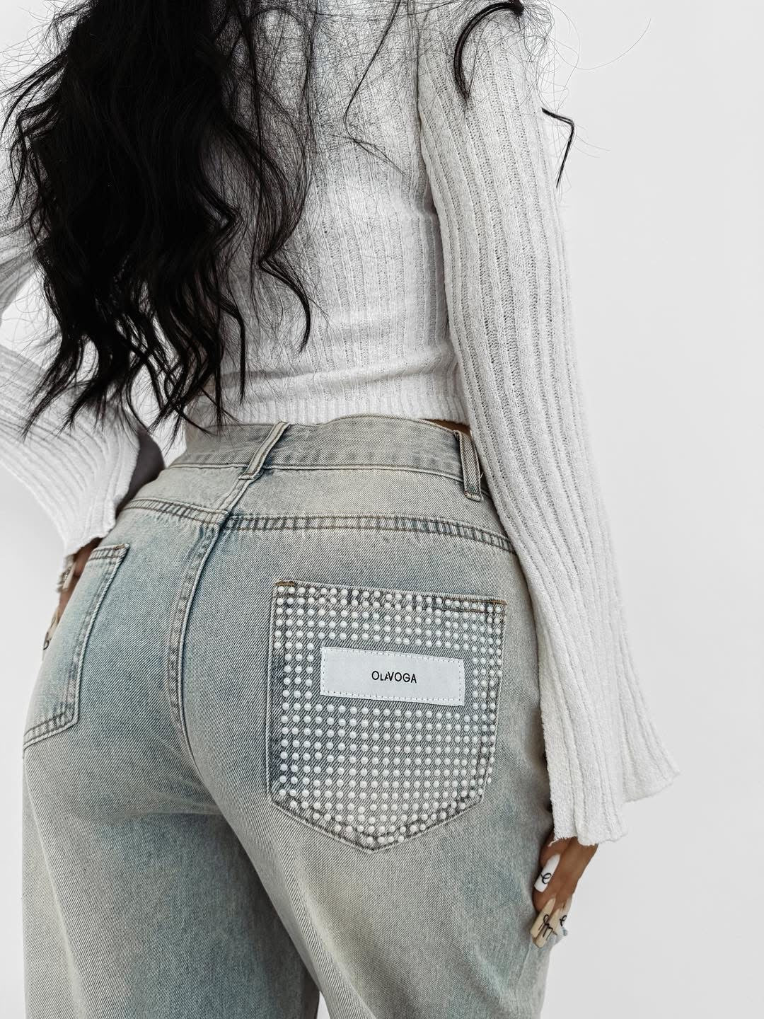 Jeansy z przetarciami w stylu vintage. Model o prostym, luźnym kroju z wysokim stanem, zdobiony efektownymi dziurami i spraniami. Wykonane z wysokiej jakości elastycznej bawełny. Na tylnej kieszeni logo marki OLAVOGA ozdobione kryształkami, podobne zdobienie na przedniej kieszeni. Logowany guzik.